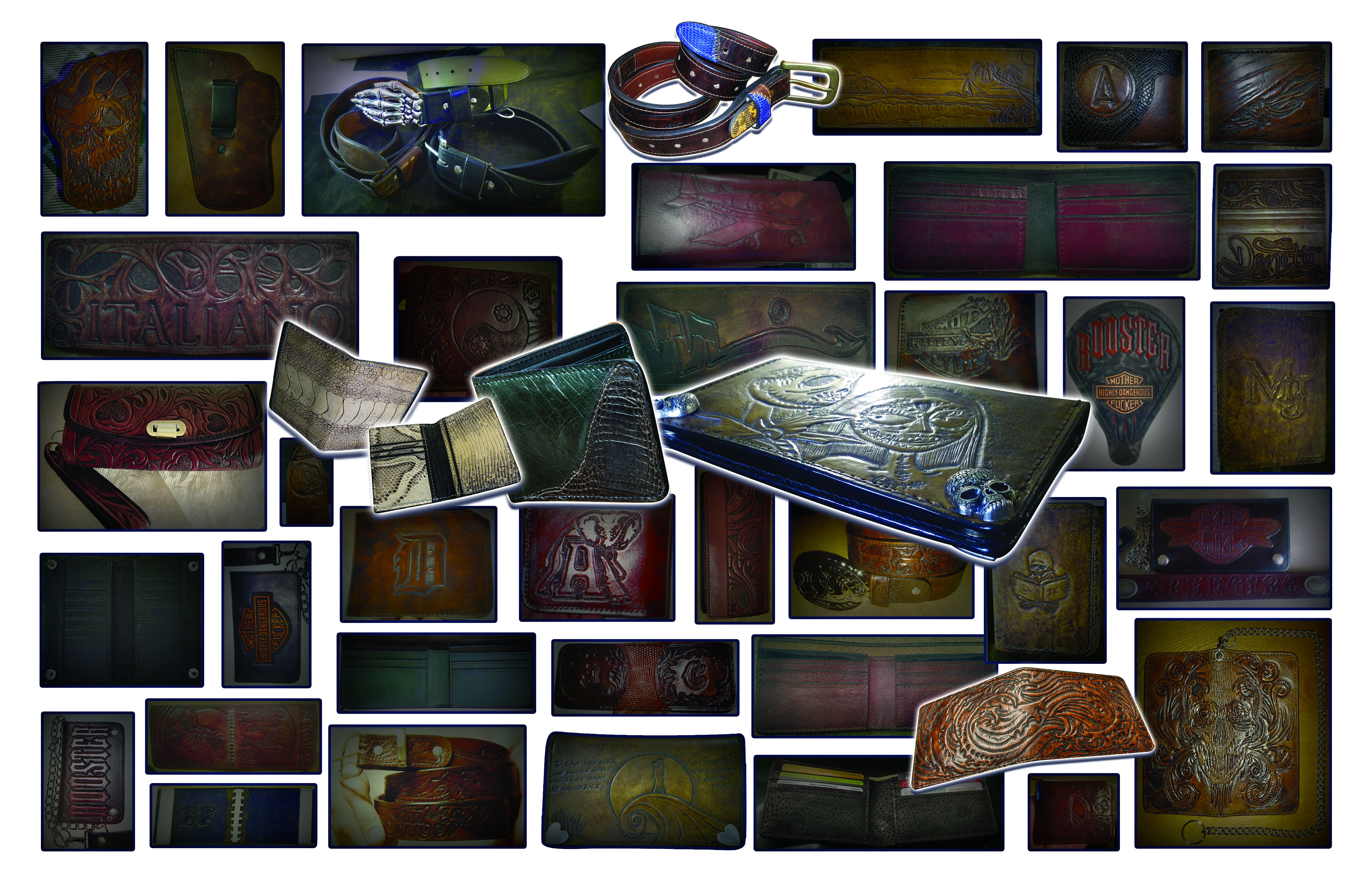 I have also tooled leather and fabricated leather accessories. This image was used as part of a graphic design project during my Bachelor's Degree coursework (some elements have been removed).